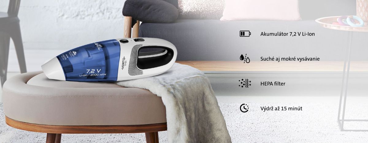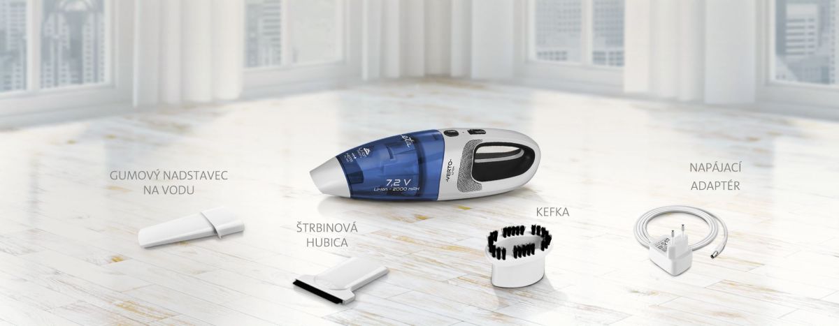 Ručný vysávač VERTO • LI-ION Li-ion akumulátor 7,2 V • výdrž akumulátora 15 min. • doba nabíjania 5 hod. • HEPA filter • objem nádoby na prach 0,5 l / 120 ml vody • ergonomicky tvarovaná rukoväť • PRÍSLUŠENSTVO: štrbinová hubica, kefka s jemnými štetinkami, gumový nadstavec na vodu (stierka), sieťový adaptér • suché aj mokré vysávanie • farba: biela/modrá