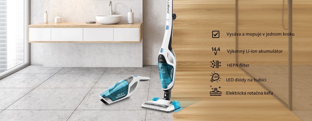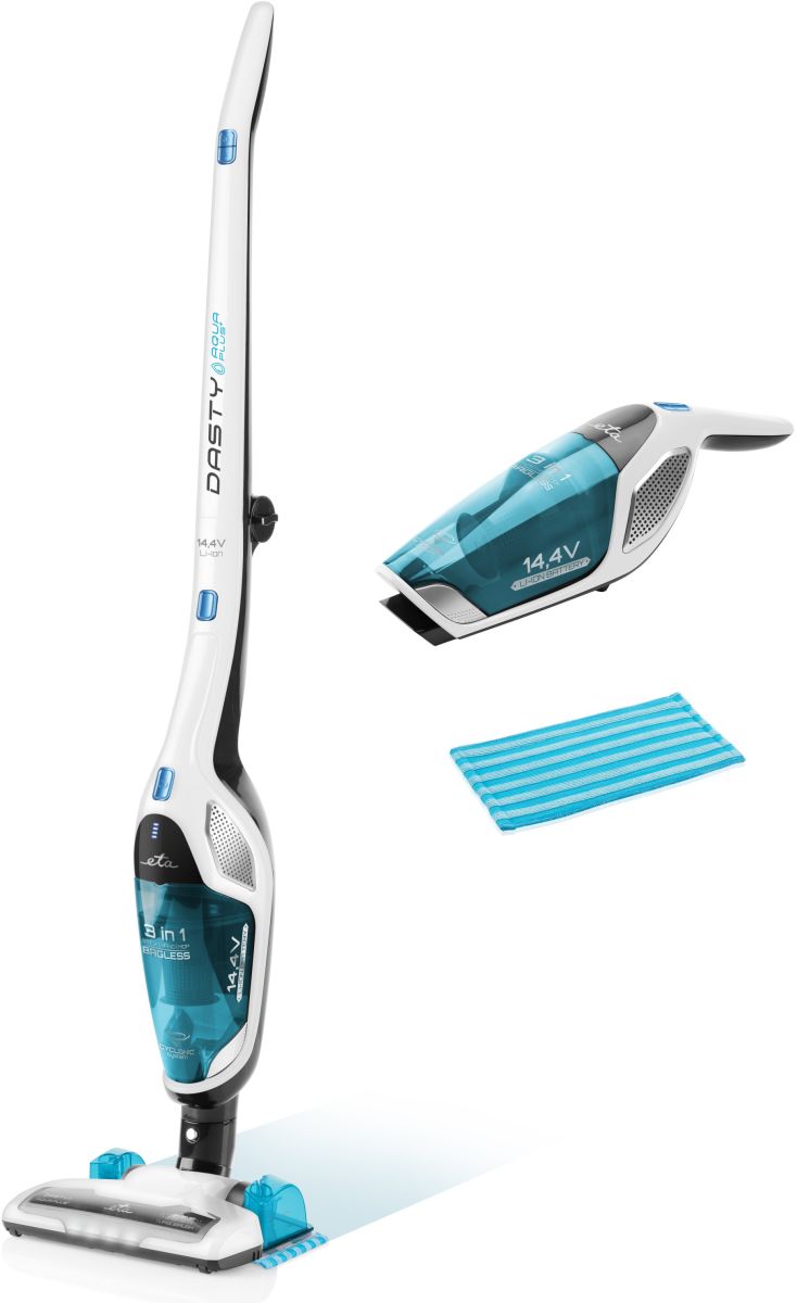 Tyčový a ručný vysávač s mopom 3v1 DASTY AQUAPLUS Li-ion akumulátor 14,4 V výdrž akumulátora 45 min. doba nabíjania 4-6 hod. vysáva a mopuje hlučnosť 80 dB(A)… Čítať viac …