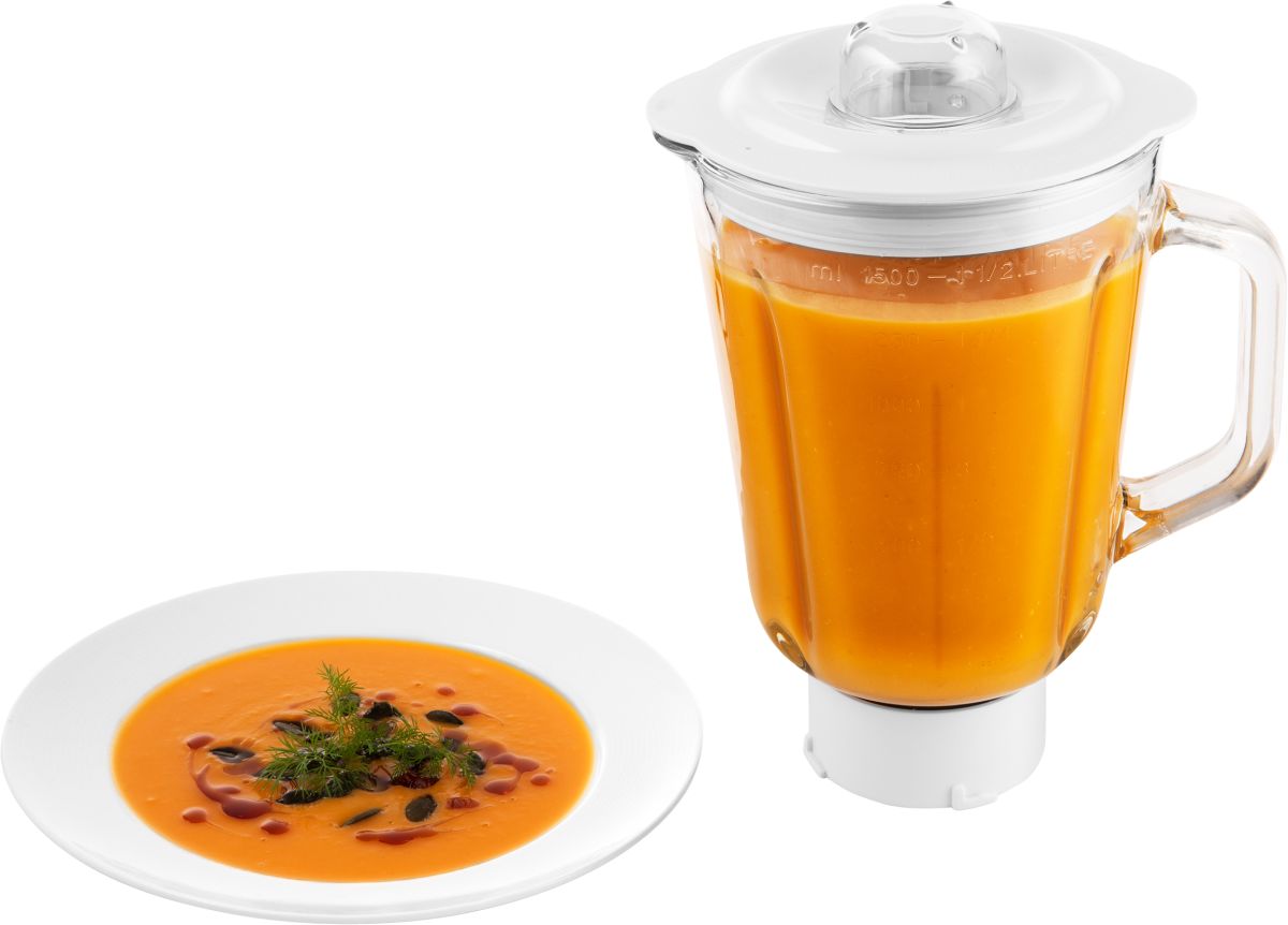 Pri pečení to nekončí - kuchynský robot má v rukáve ďalšie esá. Použite nadstavec na mixovanie a premeňte robot na vysokovýkonný mixér. 1500 W motor, kovové prevody a veľká 1,5 l sklenená nádoba vám umožnia jednoducho namixovať osviežujúce smoothie alebo horúcu polievku.
