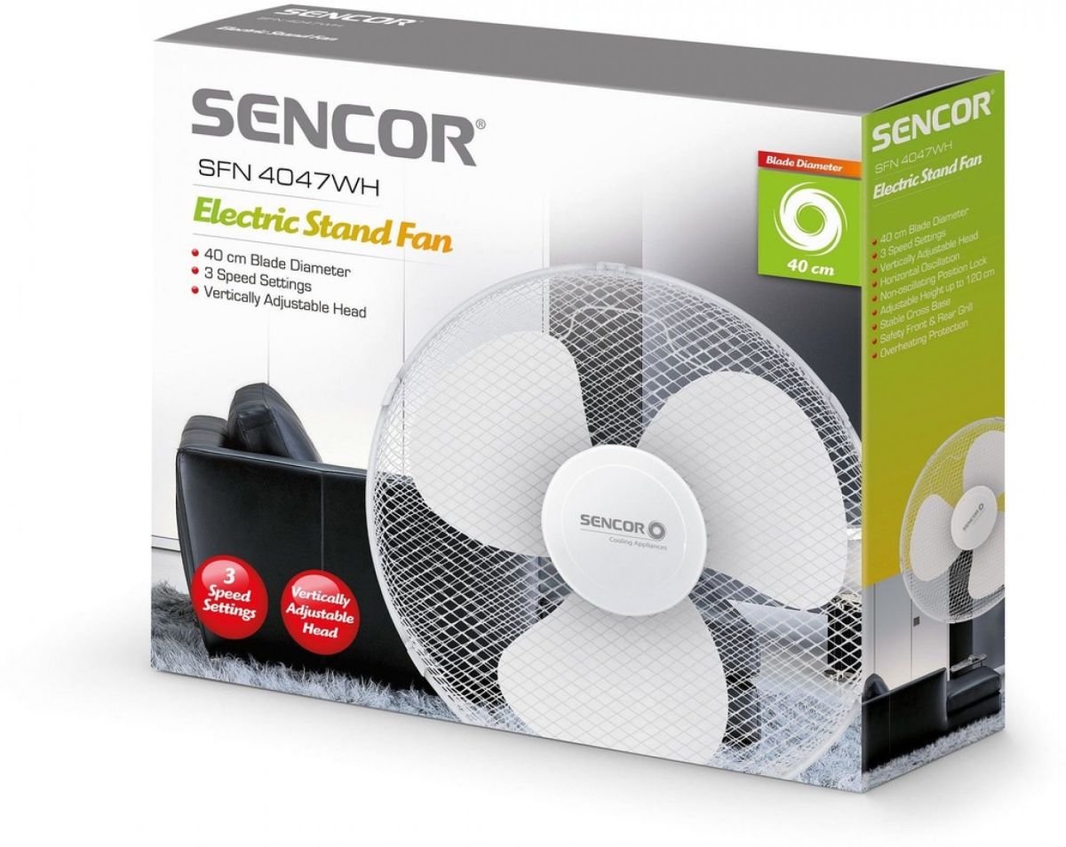 Stojanový ventilátor Sencor SFN 5200WH sa postará o potrebné osvieženie u vás doma. Je vybavený spoľahlivým a zároveň tichým BLDC motorom a na prvý pohľad vás zaujme svojim vysoko kvalitným vyhotovením. Ventilátor umožňuje jednoduché a rýchle nastavenie výšky od 113 do 135 cm. Dizajn vrtule je navrhnutý tak, aby ventilátor dosahoval maximálne tichý chod. Môžete si nastaviť jednu z 12 rýchlostí a v prípade záujmu si zvoliť automatickú horizontálnu osciláciu v uhle 80°. Okrem toho si môžete zvoliť požadovaný uhol sklonu.