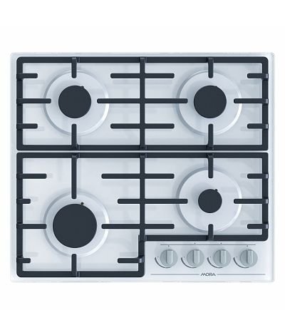 Plynová vstavaná varná platňa, Biela sklenená doska, 4 plynové horáky s poistkami STOP GAS, dvojdielna liatinová mriežka, elektrické zapaľovanie horákov v gombíkoch, sklenený povrch z tvrdeného skla, elektrické napätie 230/ 400 V, pripojenie na plyn G 1/2“