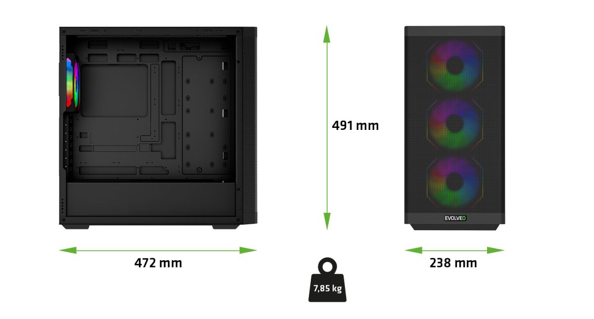 V počítačovej skrini EVOLVEO Scorpio-BK-4 je dostatok miesta na všetko, čo má nadupaná herná mašina mať. Zmestí sa sem až 415mm grafická karta, chladič procesora s výškou až 180 mm aj všetky potrebné disky – v skrini sú 4 pozície pre 3,5" HDD a 5 slotov pre 2,5" SSD. Nič vám tak nebráni zostaviť si počítač, ktorého hardvér hrá prvú ligu.